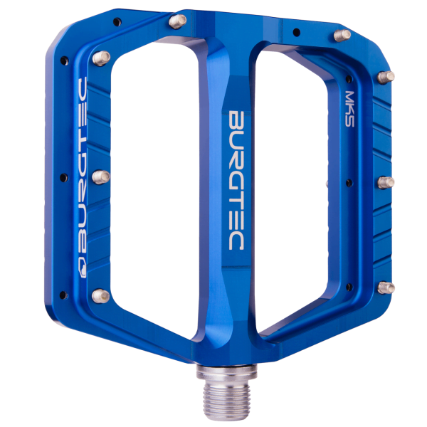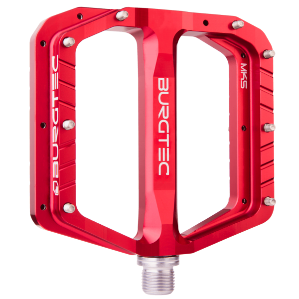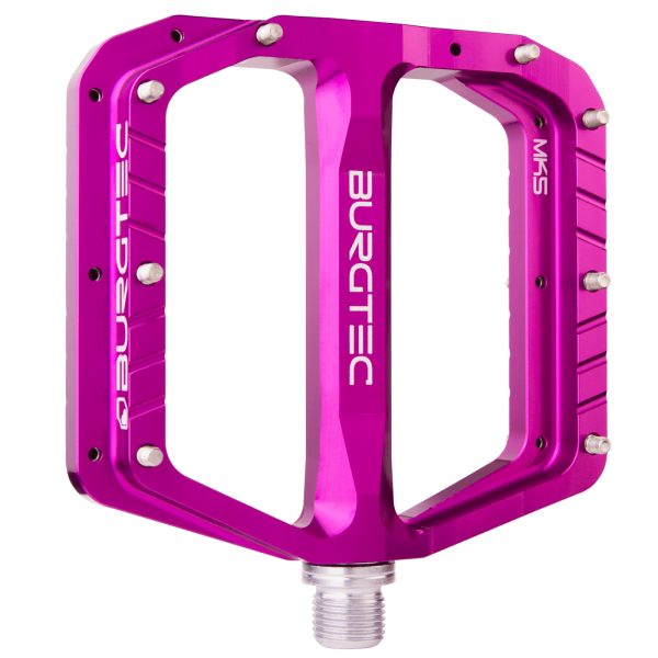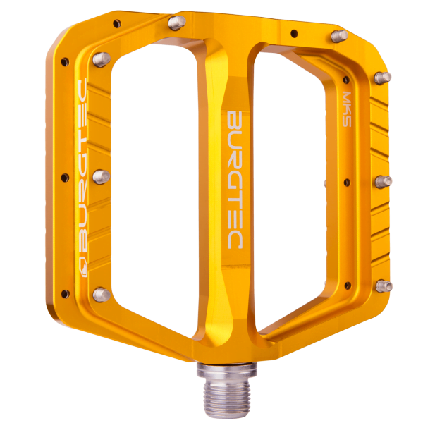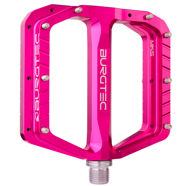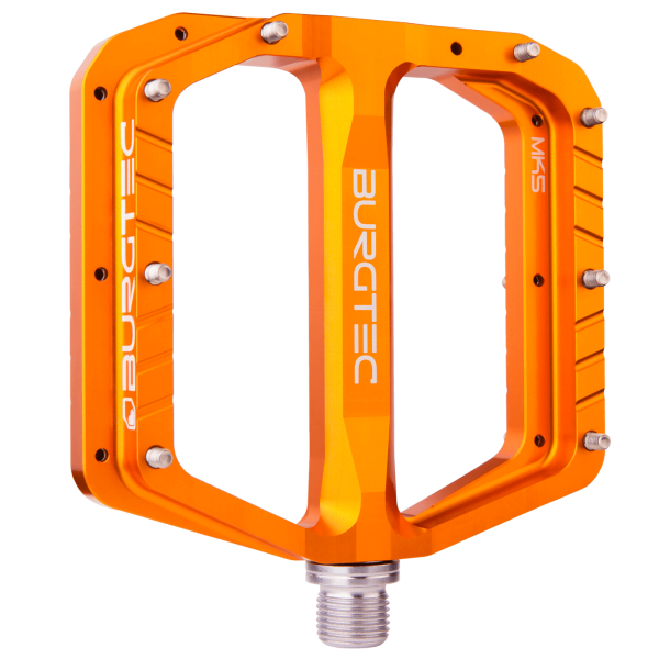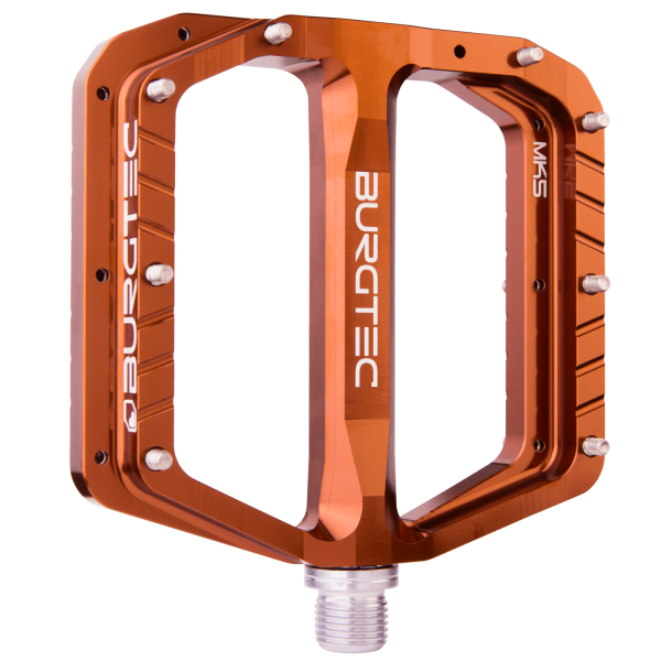 After two years of development and testing the MK5 Penthouse Flat is here. Retaining our signature toughness, the MK5 is the lightest and grippiest Burgtec pedal to date. We did this by not only increasing the size of the pedal platform, but also how concave it is alongside reducing the diameter of the pins and adding the most wear resistant internals on the market.