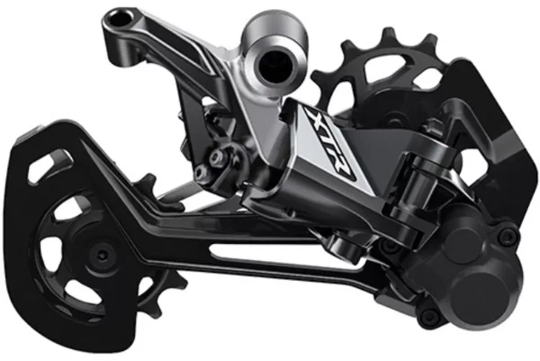The Shimano XTR RD-M9100 12-speed rear derailleur features an elegant yet aggressive angled design and an attractive anodised aluminium surface. The derailleurs feature bigger 13-tooth pulleys and include Shimano’s proven Shadow RD+ low profile technology.